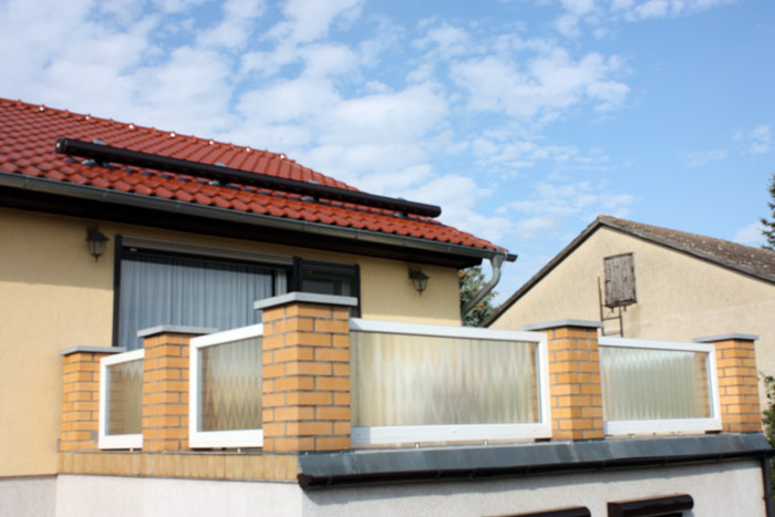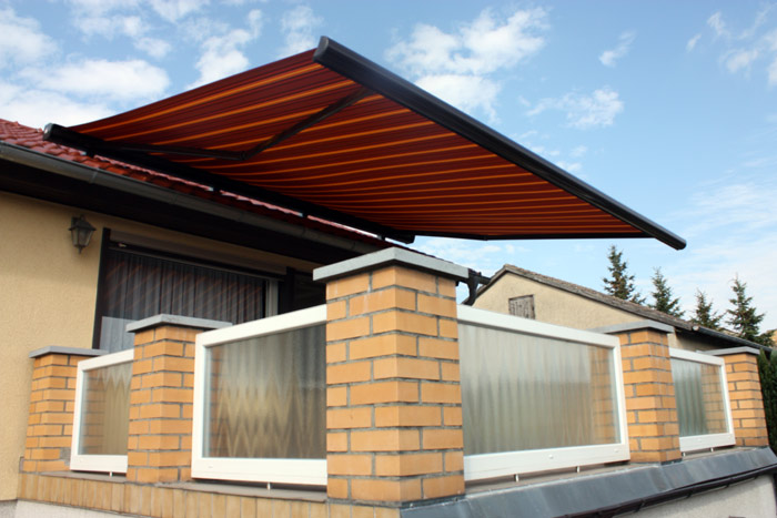Diese Markise wurde in Zusammenarbeit mit einem Dachdecker direkt auf das Dach montiert, sodass sie in eingefahrenem Zustand für die Bewohner kaum sichtbar ist.