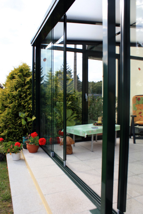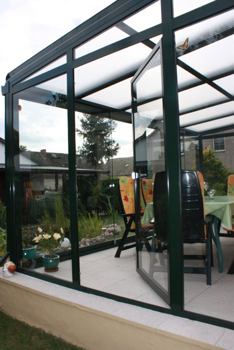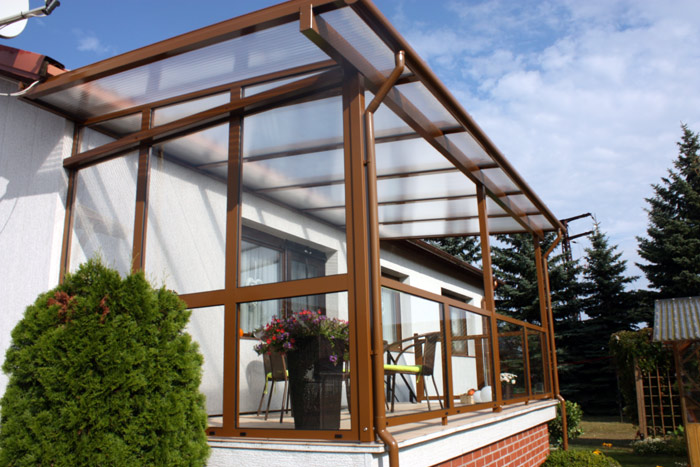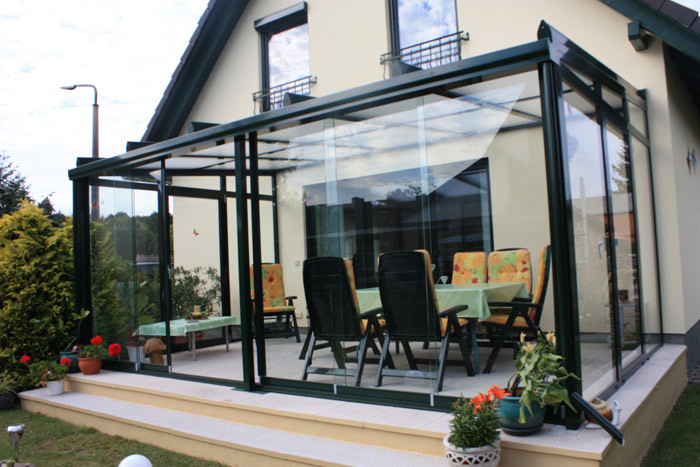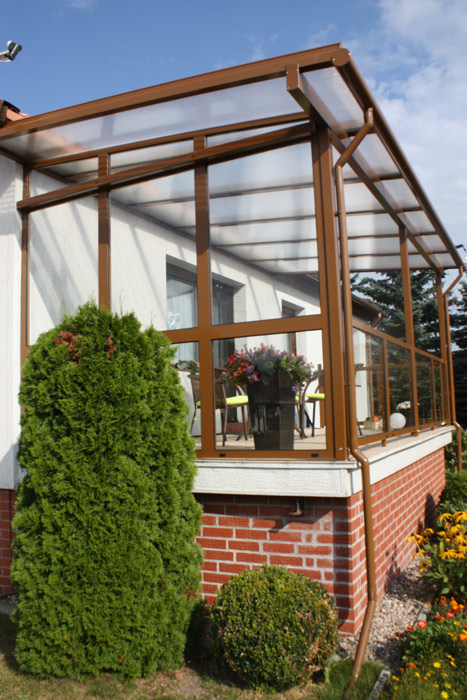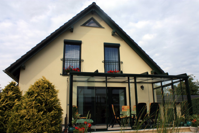 Hier wurde die Terrasse durch eine individuelle Überdachung wetterfest gemacht. Die Aluminium-Konstruktion ist in das Dach eingearbeitet und lässt viel Licht durch.